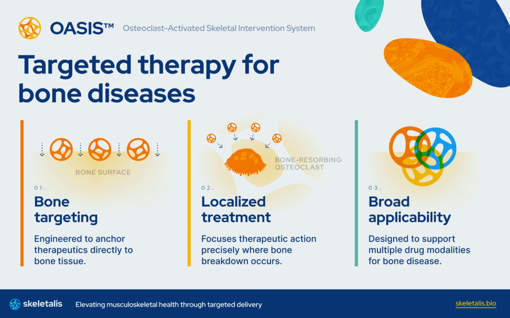 Osteoporosis affects over 10 million U.S. adults, over two thirds of whom are post-menopausal women. The disease causes fragile bones, debilitating fractures, and more than $50 billion in U.S. healthcare system costs. For decades, the standard of care in osteoporosis has asked patients to trade efficacy for safety. These therapies slow bone loss but carry rare yet devastating bone safety concerns, poor adherence, and diminishing returns. Recent regulatory reforms recognizing the urgent need for preventive, accessible bone health solutions have opened the door for innovation that finally meets patients where they are. Skeletalis is leading this new era with its bone-targeted technology, designed to deliver potent, localized disease-modulating therapy directly to the skeleton while minimizing systemic exposure. By re-engineering how osteoporosis drugs engage their target, Skeletalis aims to extend therapeutic durability, improve tolerability, and transform chronic bone care from a compromise into a true resolution of skeletal health.